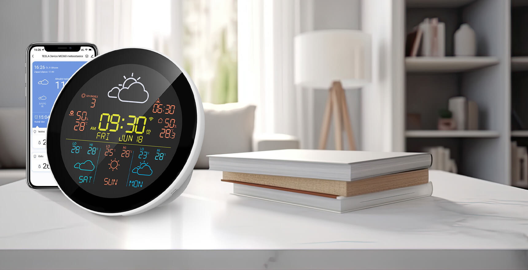 Mit der intelligenten Wetterstation TESLA Device MS360 werden Sie vom Wetter nie wieder überrascht. Dank externem Sensor und WiFi-Verbindung haben Sie stets aktuelle Informationen zu Temperatur und Luftfeuchtigkeit sowohl im Innenbereich Ihres Zuhauses als auch im Außenbereich. Die Hauptstation zeigt das aktuelle Wetter an ihrem Standort sowie detaillierte Informationen über das Raumklima an. Die von den externen Sensoren gemessenen Daten können Sie in einer übersichtlichen mobilen App einsehen, die das Überwachen von bis zu drei Sensoren an verschiedenen Standorten ermöglicht. Zudem erhalten Sie eine Drei-Tage-Wettervorhersage mit Grafiken, eine aktuelle stündliche Vorhersage sowie detaillierte Informationen zu Sonnenauf- und -untergang und zum UV-Index. Die Station TESLA Device MS360 ist der ideale Helfer für alle, die jederzeit und überall einen perfekten Überblick über das Wetter haben möchten. Dank einfacher Installation und intuitiver Bedienung kann sie jeder nutzen.