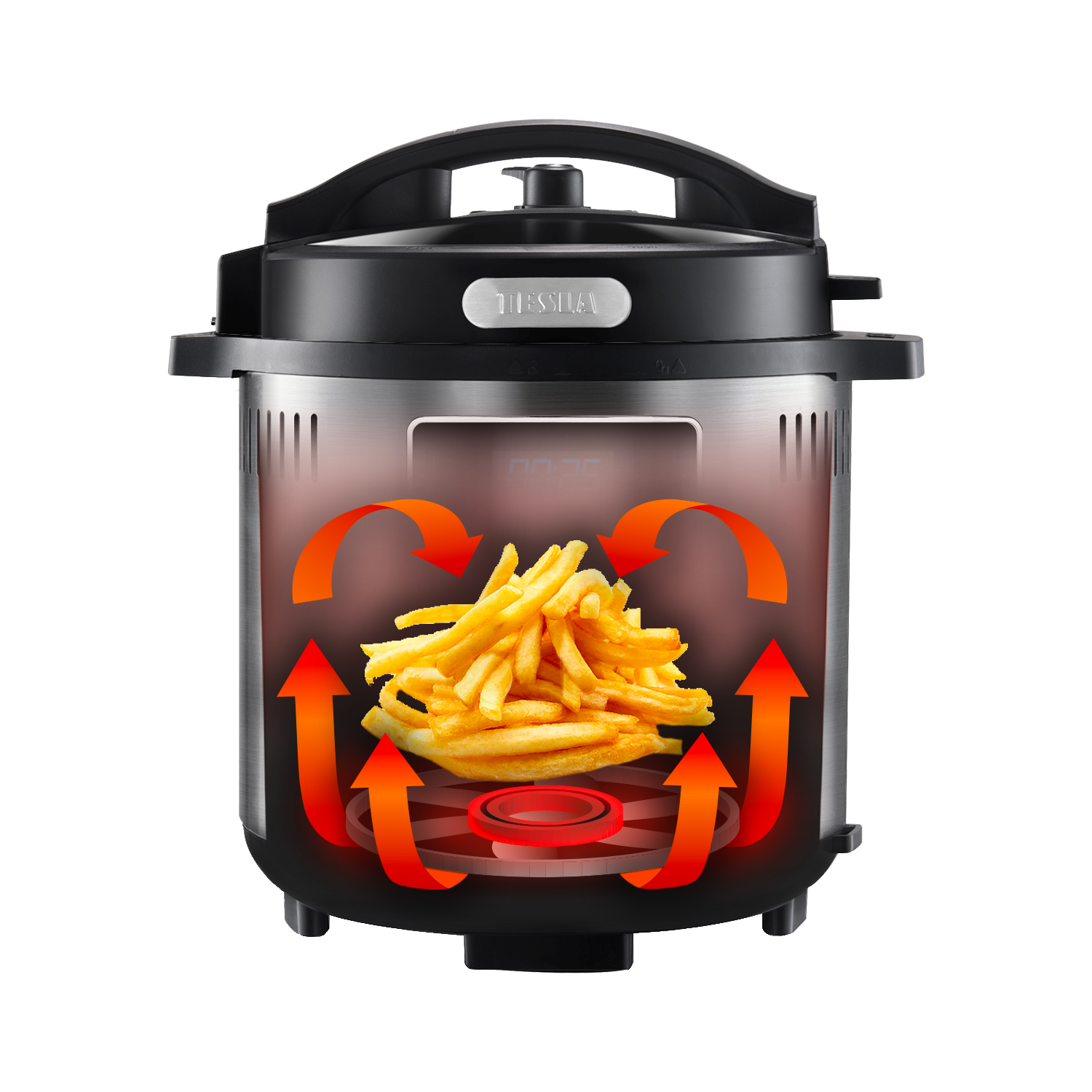 The TESLA EliteCook K80 Deluxe Multifunctional Electric Pressure Cooker is a pressure cooker, hot air fryer, slow cooker, sous vide, rice cooker, yogurt maker, steamer, frying or saute pan, egg cooker, food warmer, food dryer, sterilizer.