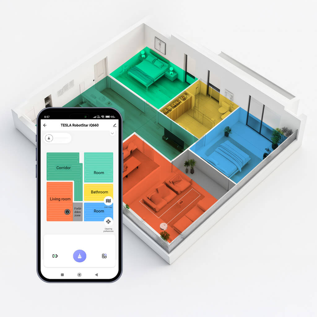 TESLA RoboStar iQ660 with voice commands announces the immediate status and movement of the vacuum cleaner, which is monitored with the help of intelligent diagnostics. The TESLA Smart application for smartphones is available for Android and iOS.