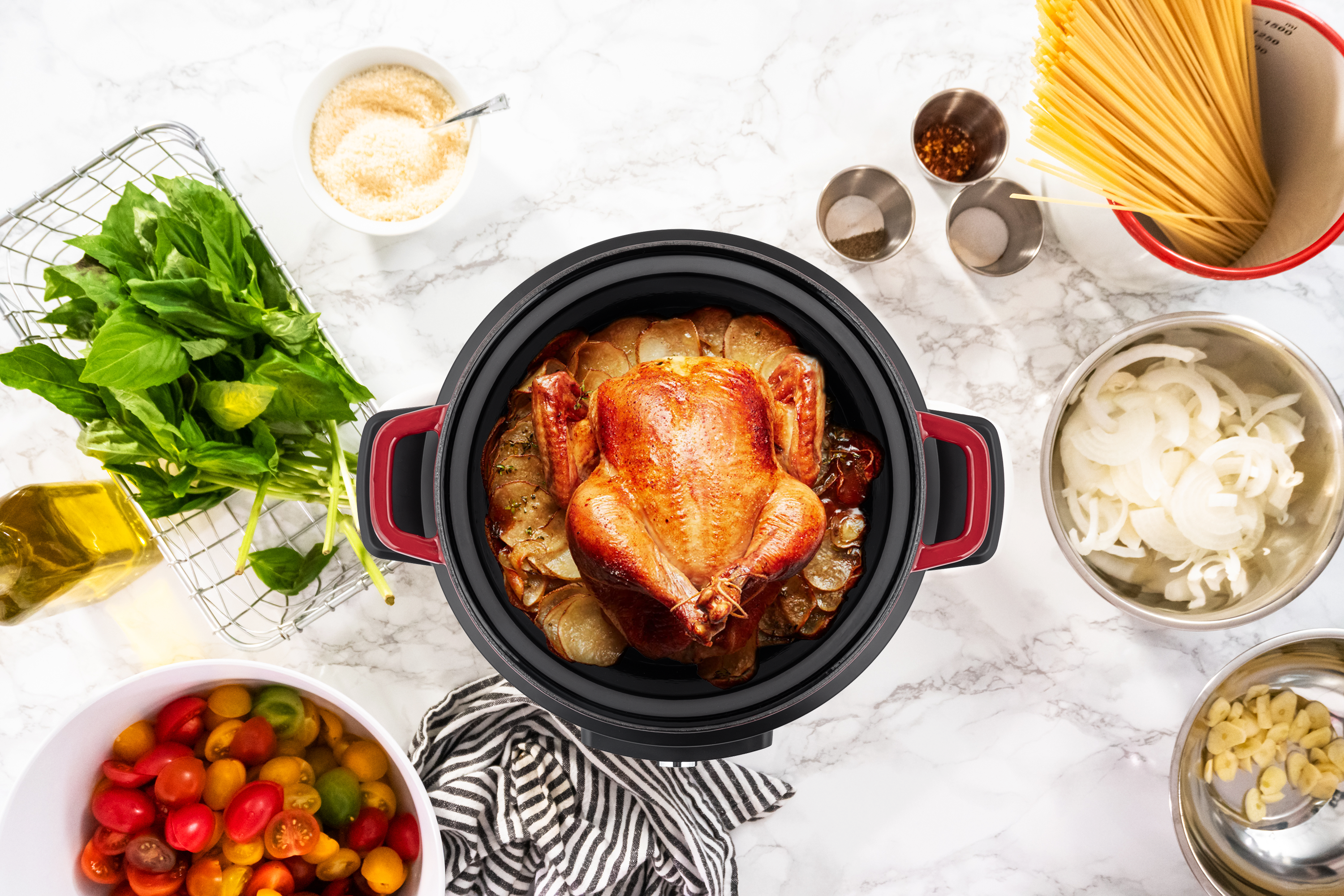 Garnek wewnętrzny można wyjąć z podstawy, dzięki czemu można go używać na kuchence indukcyjnej, elektrycznej, gazowej lub w piekarniku. Wygodne podawanie potraw bezpośrednio na stół umożliwia praktyczna silikonowa mata oraz silikonowe nakładki na uchwyty. Ten wielofunkcyjny garnek jest gotowy, aby zaspokoić wszystkie Twoje kulinarne potrzeby, jednocześnie dodając odrobinę elegancji do Twojej kuchni