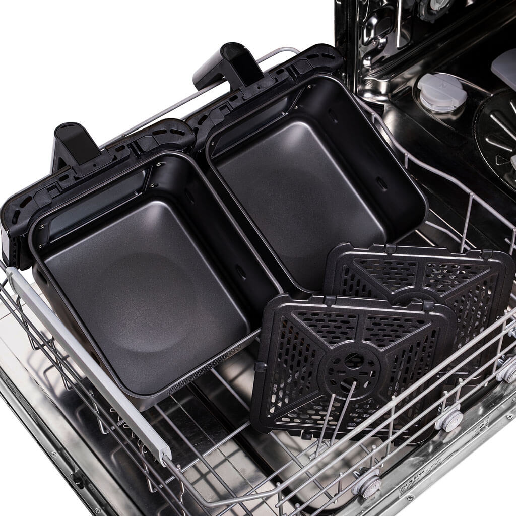 Chytré funkce umožňují připravit více pokrmů bez zbytečného čekání. Sync Cook nastaví stejnou teplotu a dobu ohřevu pro oba koše najednou, což usnadňuje přípravu většího množství jídla. Pro vaření různých pokrmů s odlišnými nastaveními slouží funkce Sync Finish, která zajistí, že budou hotové současně. Hranolky i maso tak budou vždy čerstvé a připravené k podávání ve stejný moment.